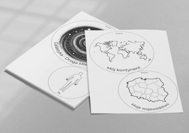 Zestaw „Moje miejsce we Wszechświecie – karty do uzupełnienia” to wyjątkowy materiał edukacyjny inspirowany pedagogiką Montessori. Dziecko krok po kroku odkrywa swoje miejsce – od nieskończonego kosmosu, przez Układ Słoneczny, Ziemię i kontynent, aż po kraj, województwo, miejscowość i dom.