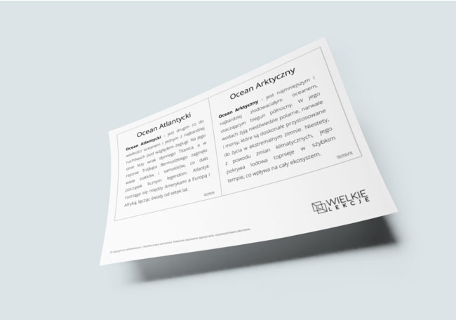 Oceany świata – karty trójdzielne z opisami to wyjątkowy materiał edukacyjny, który zamienia naukę geografii w fascynującą przygodę. Stworzony z myślą o dzieciach w wieku 6–9 lat, pozwala odkrywać tajemnice pięciu oceanów, rozwijając wiedzę, pamięć i ciekawość świata.