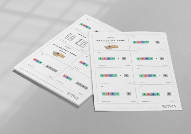 Prawdziwy bank – 4 serie zadań to kompletny zestaw materiałów edukacyjnych przygotowany do pracy z prawdziwym bankiem Montessori. Produkt wspiera naukę mnożenia w sposób uporządkowany, konkretny i zgodny z metodą Montessori, pomagając dziecku stopniowo rozwijać umiejętności matematyczne oraz coraz lepiej rozumieć zapis działań.
