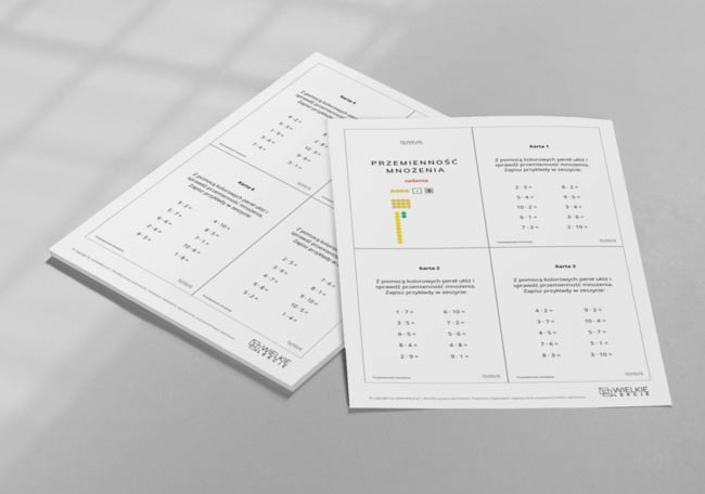 Zestaw składa się z 4 kart A4, a na każdej stronie znajdują się 4 karty z zadaniami. Materiał zawiera łącznie 15 kart, a na każdej z nich umieszczono 10 zadań z zakresu małej tabliczki mnożenia. To daje bogaty zestaw ćwiczeń, który pozwala dziecku systematycznie utrwalać zasadę przemienności mnożenia.